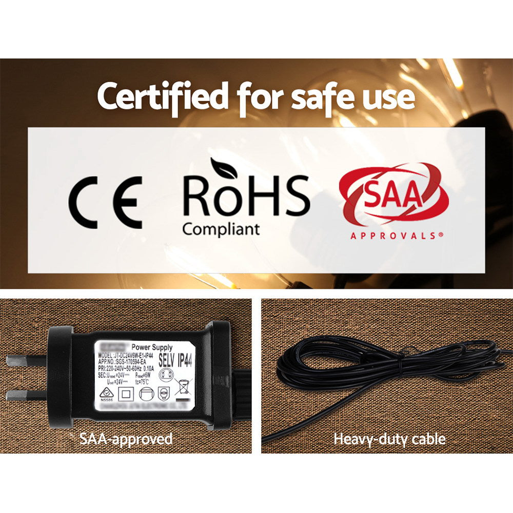 Nuestras guirnaldas de luces Festoon son ideales no solo para bodas, fiestas de cumpleaños o eventos especiales, sino también para crear un ambiente cálido y acogedor con su brillo brillante y suave. Adecuadas tanto para uso en interiores como en exteriores, su clasificación IP44 significa que se pueden usar bajo la lluvia y en todas las condiciones climáticas. Cada bombilla consume un voltaje muy bajo y se coloca a 90 cm de distancia entre sí a lo largo de sus 41 m de longitud para una distribución uniforme de la iluminación y el brillo. No menos importante, cada bombilla tiene una vida útil de 20 000 horas, por lo que puede usar las guirnaldas de luces durante bastante tiempo.