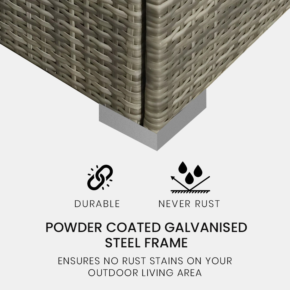 The London Rattan 4 Seater Outdoor Lounge Set is a stylish yet affordable setting designed to provide utmost comfort. The London Rattan outdoor furniture setting has a durable galvanised steel frame with additional powder coating, ensuring no rust stains on your outdoor living area.