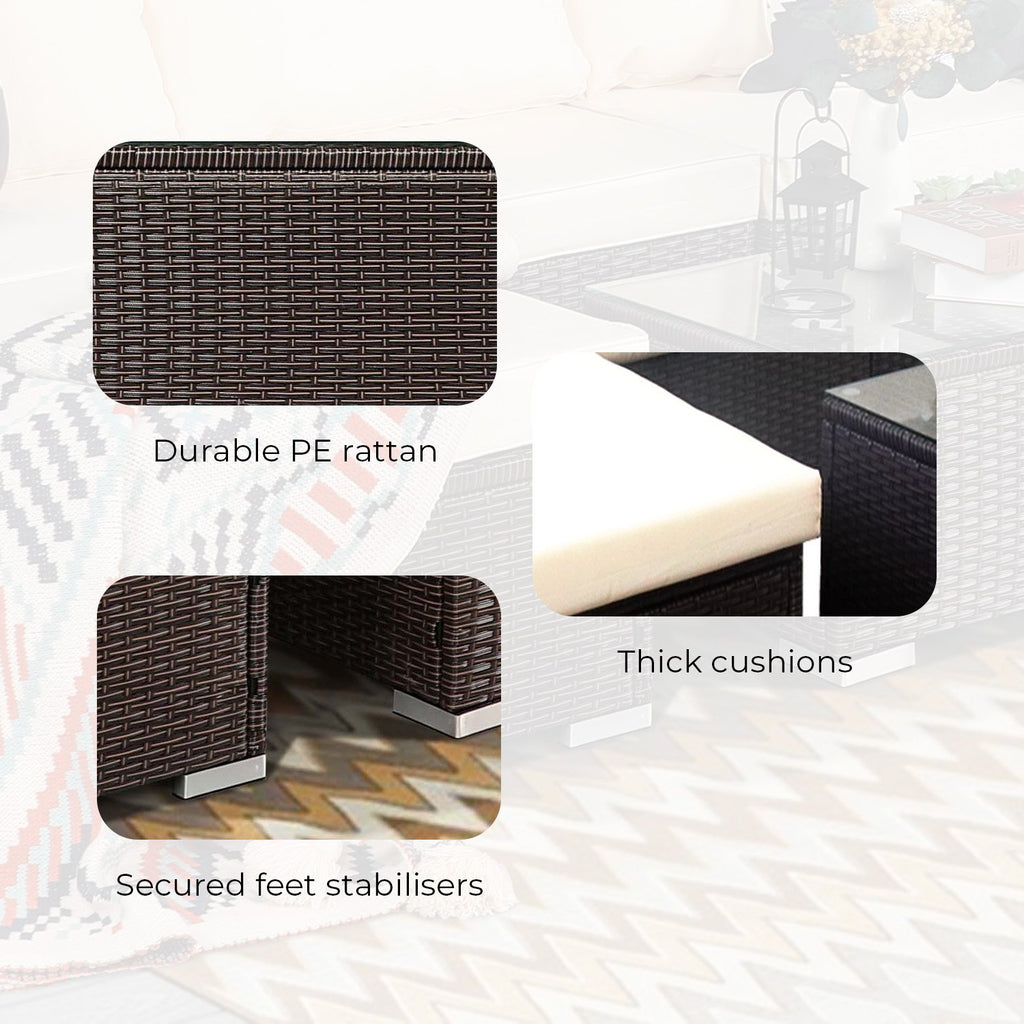 This lounge set is finely constructed with synthetic wicker for lasting durability and style. It's completely weather-resistant, so you don't need to worry about leaving it out in the rain or sun. The thick, waterproof cushions provide wonderful comfort, while the galvanized steel frame offers sturdy support.