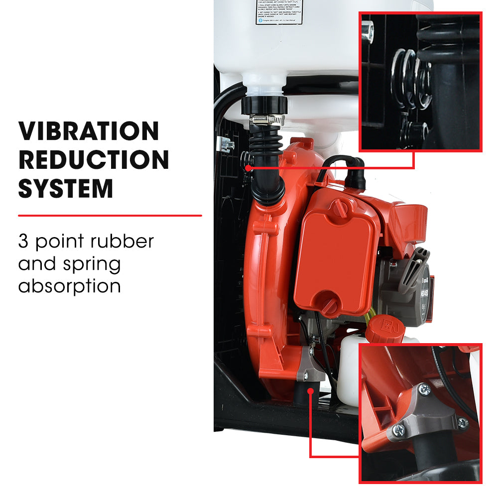 Baumr 动力喷雾器干重仅为 9.5 公斤,配有厚桨叶,背带易于调节,可提供最大舒适度。符合人体工程学的背垫设计可减少疲劳。