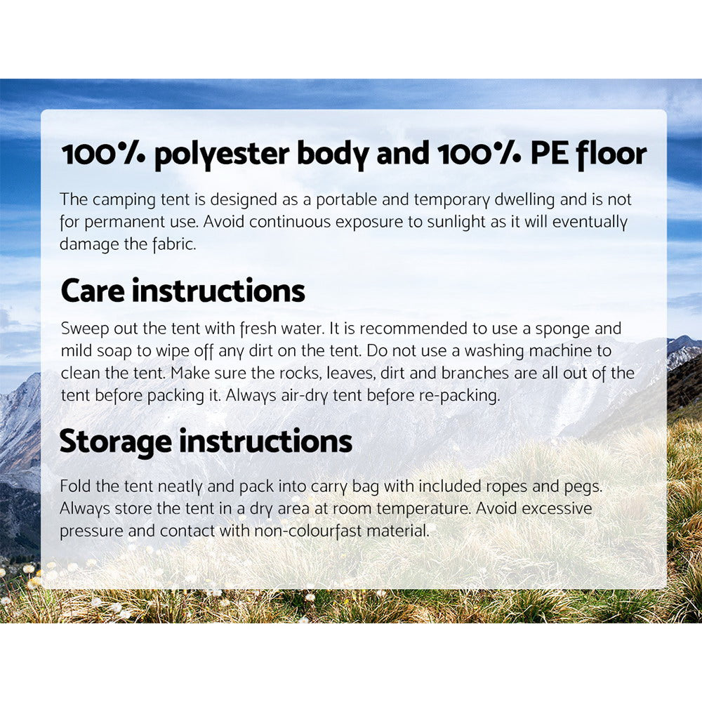 现在,当您带着我们的 Weisshorn 5 人弹出式帐篷去露营时,您可以花更少的时间搭建帐篷,而花更多的时间放松或探索户外。搭建和收起帐篷都很容易,一个人就可以完成。事实上,搭建帐篷只需不到一分钟 - 只需将其扔到空旷的地方,然后看着它立即弹出。帐篷采用优质重型 190T 聚酯材料制成,带有 PU 涂层,可有效阻挡雨水和紫外线。钢杆经久耐用,非常坚固,可让您的帐篷坚固耐用。为了在帐篷内提供充足的光线和通风,帐篷配有网状窗户,超大入口可通过方便的拉链轻松打开和关闭。走进去,五个人会欣赏到宽敞的空间。因此,您可以放心地进行山地公路旅行或享受美妙的户外家庭野餐,只需将弹出式帐篷及其方便的手提袋装进您的车里即可。祝您旅途愉快!
